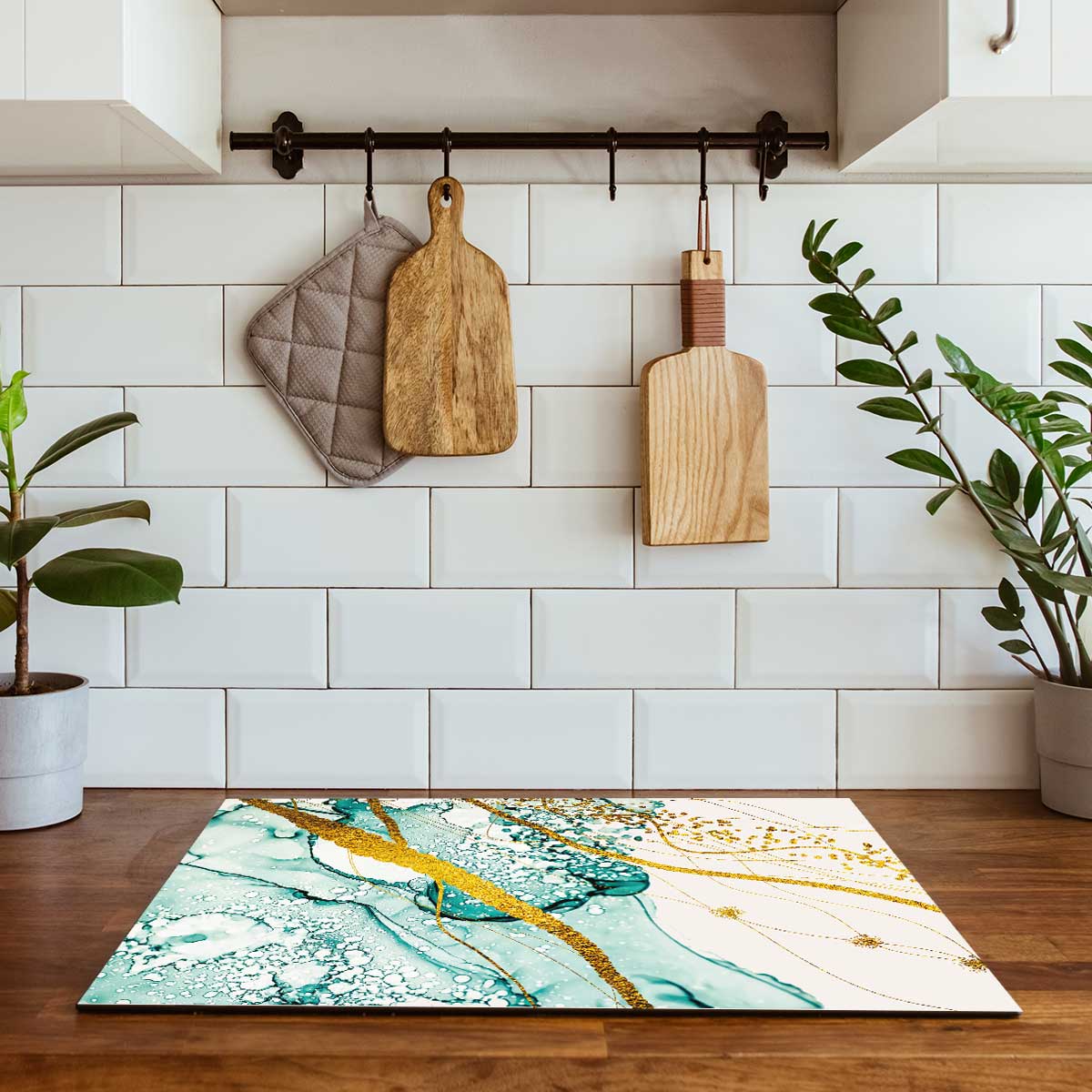 De inductiebeschermer kan ook gebruikt worden als decoratief werkblad, serveeroppervlak of fotobasis voor accessoires.