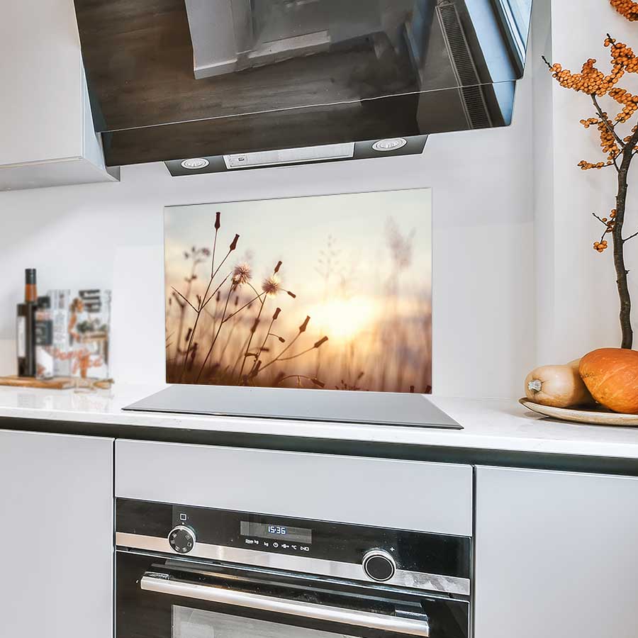 Praktisch en stijlvol: het spatscherm van Kookio beschermt je keukenmuur tegen vet, vocht en hitte.