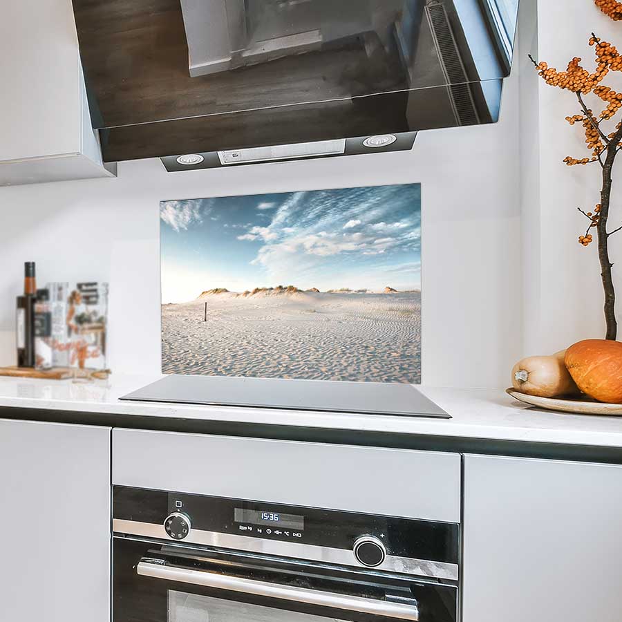 Praktisch en stijlvol: het spatscherm van Kookio beschermt je keukenmuur tegen vet, vocht en hitte.